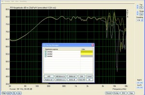 Nun, mit den Bauteilewerten, welche die Simulation ergab, stellte sich zwar ein gegenüber der unbeschalteten Variante deutlich besserer Frequenzgang ein, aber erst nach dem Tausch einiger Bauteilewerte waren Simulation und gemessener Frequenzgang in etwa ähnlich: