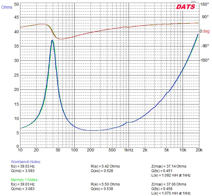 Auf eine vollständige TSP Messung habe ich verzichtet, da eine solche bereits vom italienischen Kollegen Diego von Dibirama vorgenommen wurde. Die Messung weicht minimal vom Datenblatt ab, was aber in Konsistenz erfolgt. Das bedeutet, dass die leicht unterschiedlichen TSP Sätze zu identischer Gehäuseabstimmung führen. Testweise, und um zu verifizieren, dass die Chassis fehlerfrei sind, habe ich eine Quick ’n Dirty TSP Messung ohne Ermittlung von VAS durchgeführt. Meine Messung weist noch etwas höhere Werte für Fs und Qts aus. Vas wird dann entsprechend niedriger ausfallen. Die Messung habe ich an den frisch ausgepackten und eiskalten Chassis sofort nach der Lieferung an einem frostigen Tag gemacht.