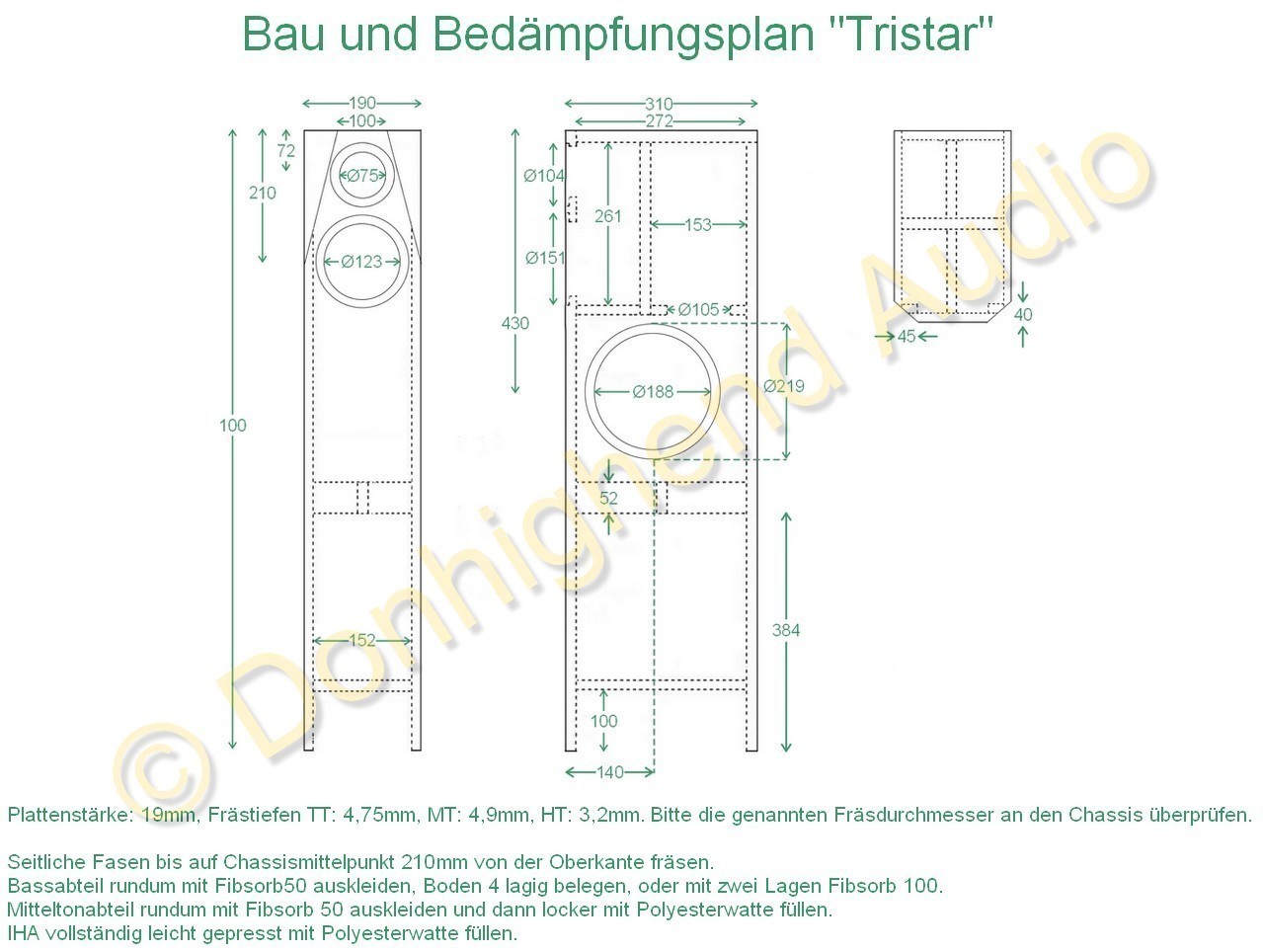 Die Tristar ist ein günstiger, aber klanglich hervorragender Lautsprecher im preiswerten Segment. Chassis, Weichenteile, Zuschnitt und Kleinteile sollten sich bei günstigem Einkauf für unter 200,- Euro pro Seite über die Ladentheke gehen. Dafür bekommt man einen vollwertigen Lautsprecher, der vollends überzeugt. Er bietet Tiefgang bis in Regionen zwischen 40 und 45 Hz. Die gewissenhafte Abstimmung mit Blick auf gutes Abstrahlverhalten und ausgewogene Wiedergabe überzeugt in klanglicher Hinsicht ohne jeglichen Zweifel.