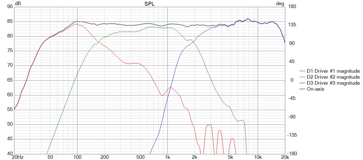 Die Messungen mit der auf dem bewährten Klemmbrett gesteckten Frequenzweiche zeigen ein identisches Ergebnis. Durch die Tatsache, dass die Simulationen nur mit der 90° Messung des Tieftöners erstellt wurden, weichen die Messungen im Bereich der Trennfrequenz naturgemäß etwas ab, weil der Tieftöner durch die Veränderung des Messwinkels seine Position verändert.