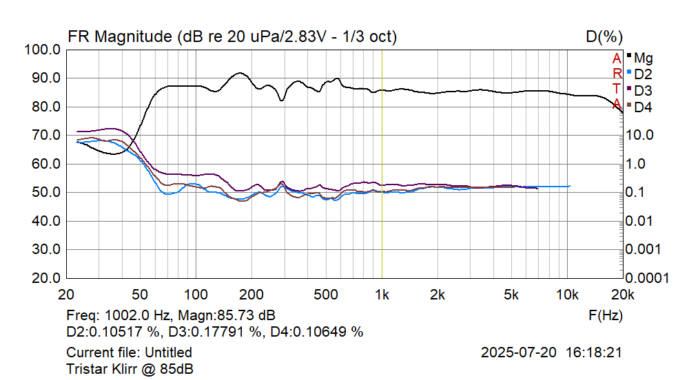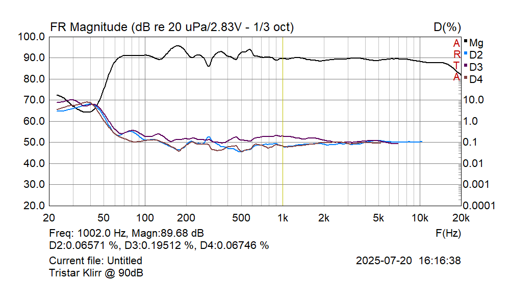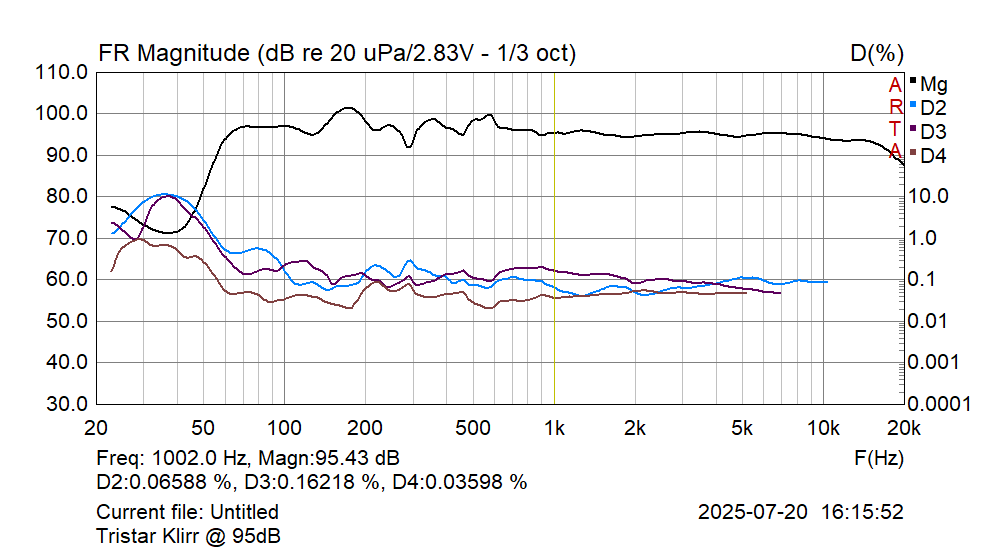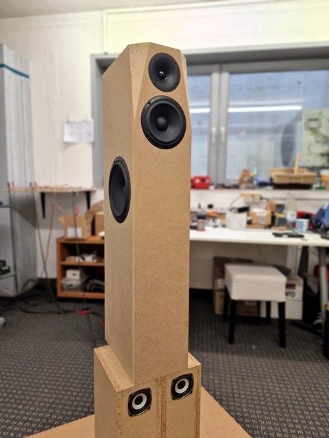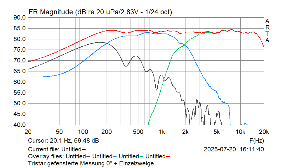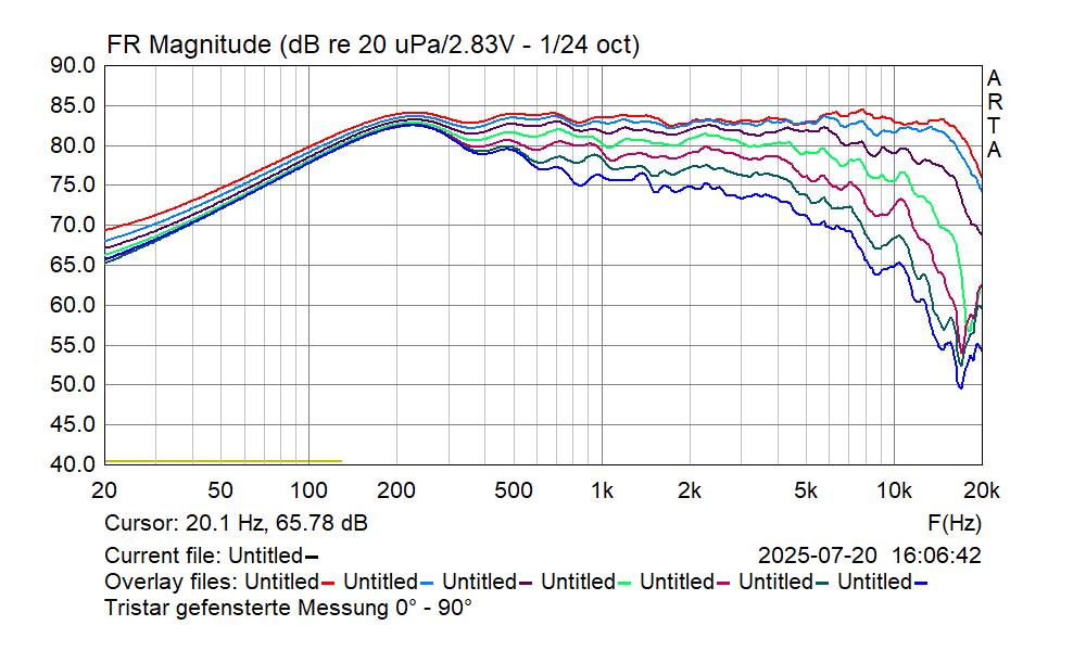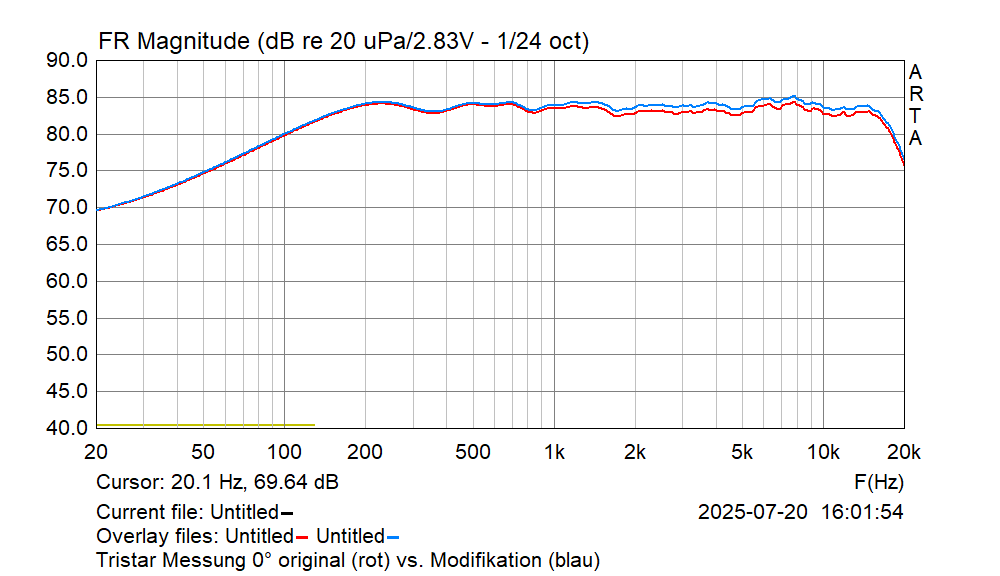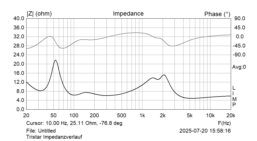 Auch dieser kleine Indonesier weist ein hervorragendes Verhalten auf. Sein nutzbares Frequenzband reicht bis rund 4kHz, bevor sich in höheren Gefilden eine mäßig bedämpfte Resonanz zeigt, die aber bei steilflankiger Trennung und sorgfältiger Beschaltung keine Hürde darstellt. Es ist geplant, im Bereich um 2,5kHz an einen Hochtöner zu übergeben. Dieser weicht allerdings von Klaus Klebers zunächst vorgesehenem Chassis ab. Hatte er die bereits in seinem Kompaktlautsprecher verwendete SB26ADC-C000-4 auserkoren, wird es in der Tristar im Hinblick auf ein noch gleichmäßigeres Abstrahlverhalten die in der DAUmino Serie bewährte ND25FW-4 von Dayton.