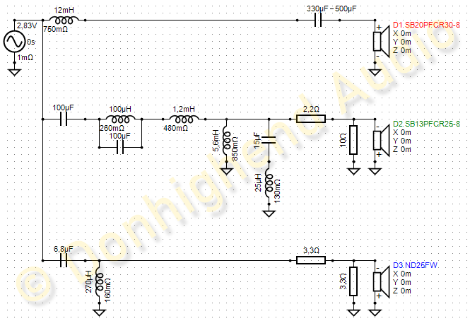 Die verwendeten Chassis sind von preiswerter Natur, was ihre grundsätzliche Qualität aber nicht schmälert. In ihren Arbeitsbereichen spielen die Kollegen sehr linear und ausgewogen, und auch die Verzerrungen bewegen sich auf unkritischem Niveau. Wegen der inzwischen recht kostspielig gewordenen Weichenbauteile galt es aber, die Topologie der Weiche so zu gestalten, dass der finanzielle Aufwand für die Bauteile in einem vertretbaren Verhältnis zu den Kosten für die Bestückung steht. Nach diversen Versuchen mit unterschiedlichen Flankensteilheiten und einer Vielzahl an möglichen Topologien stellte sich heraus, dass sich ein perfektes Zusammenspiel des Seitenbasses und des frontseitigen Tiefmitteltöners einstellt, wenn der Tieftöner mit einem schlichten 6dB Filer in Form einer 12mH Spule beschaltet wird. Der große Spulenwert lässt im ersten Moment eine kostspielige Lösung vermuten. Genau dies ist nicht der Fall, da das befürchtete Aufbuckeln im Oberbassbereich deutlich geringer ausfällt, als es bei Verwendung einer Weiche höherer Ordnung der Fall ist. Somit kann ein korrigierender Saugkreis, der wiederum Bauteile mit hohen Werten erforderlich macht, vollends entfallen.