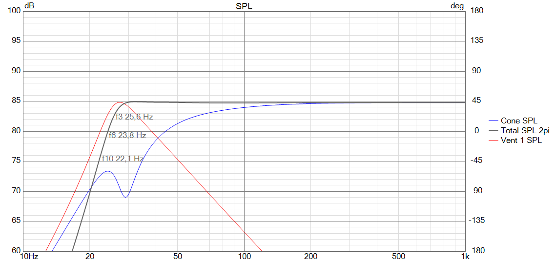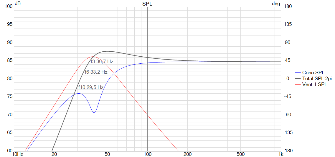 Zunächst habe ich eine Simulation erstellt, die das Chassis in einem 37 Liter großen Volumen und einer BR Abstimmung auf 38 Hz zeigt.