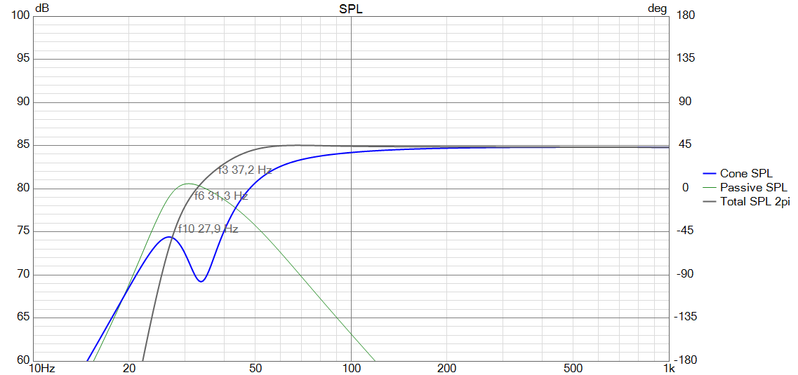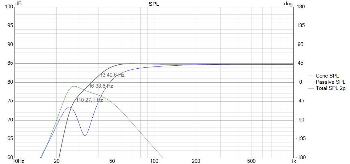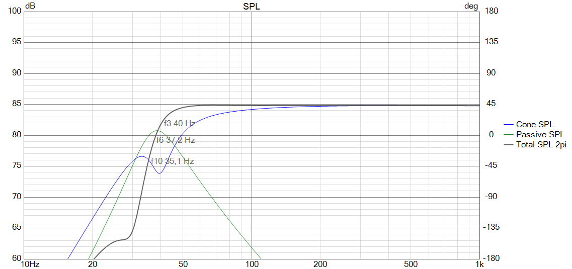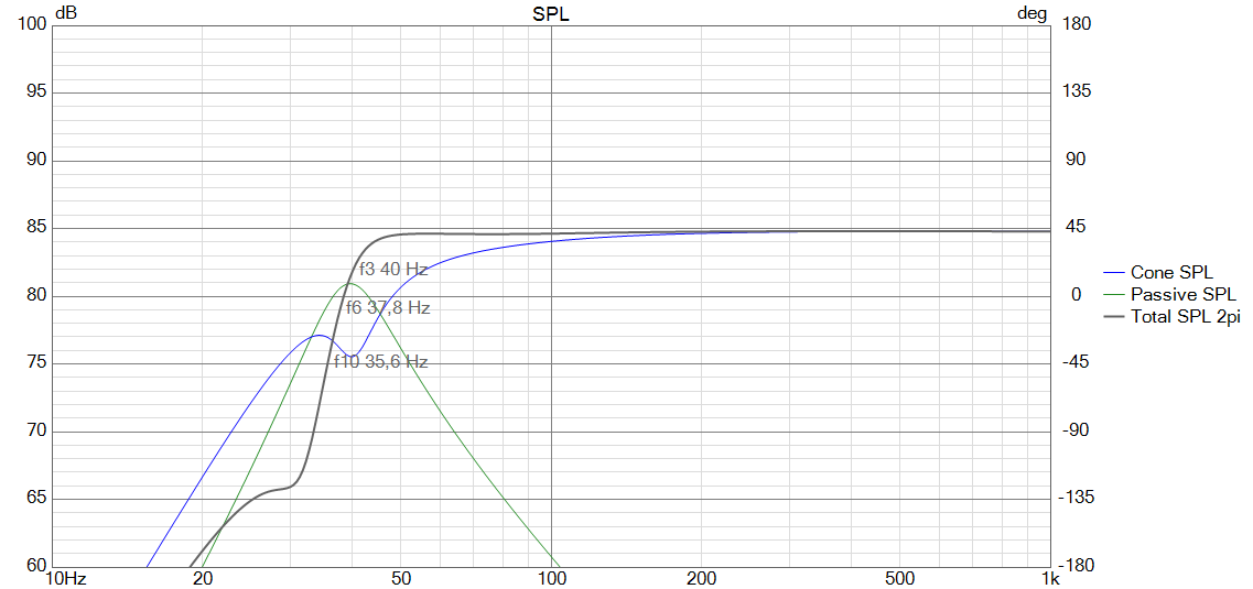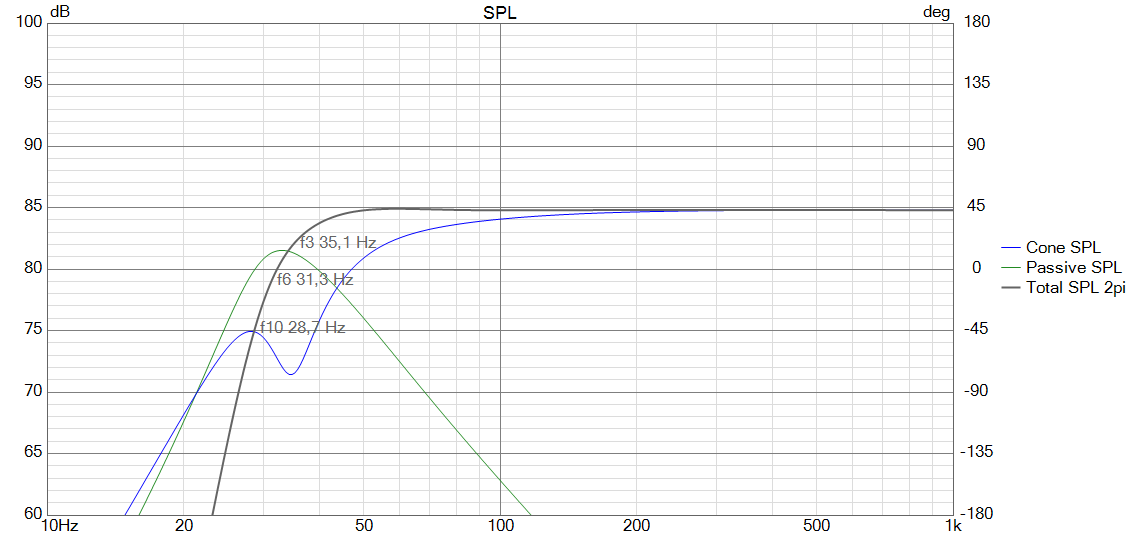 Im zweiten Gang wurde der fiktive Port durch einen Dynavox DY166/9A als Passivmembran ersetzt. In den vorgegebenen 31,5 Litern @ 1100µF stellt sich eine sehr gute Performance ein, die eine Grenzfrequenz von 40 Hz prognostiziert.