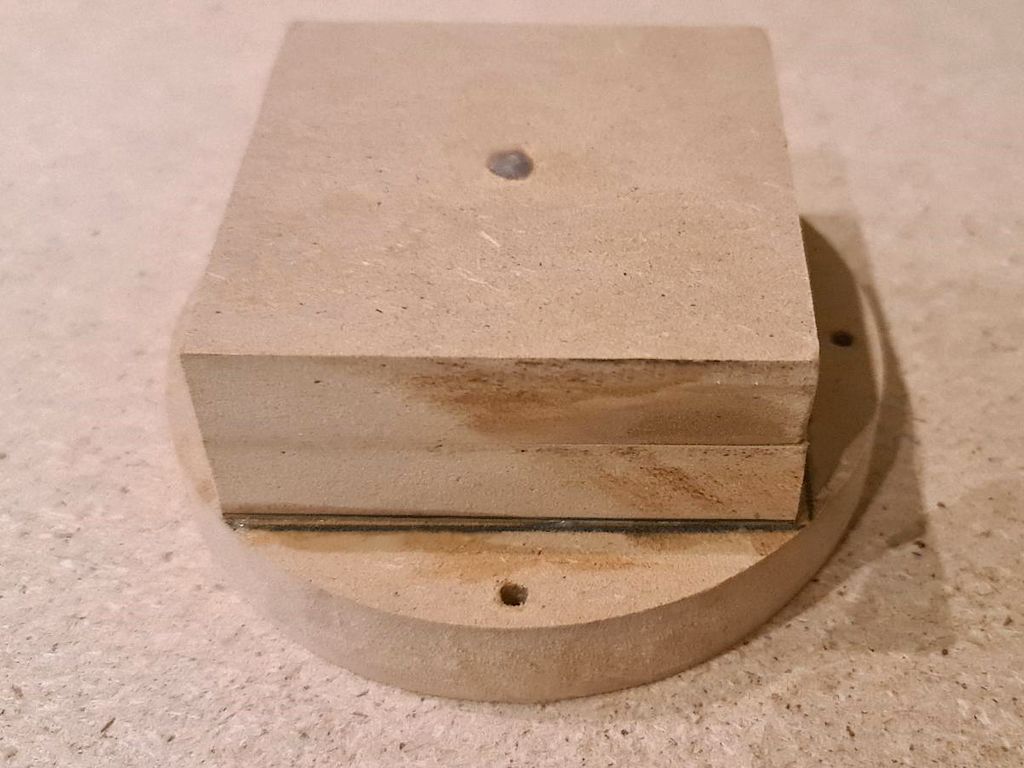 Für die Befestigung des FRS5X auf dem auf ca. 26 mm heruntergeschliffenen WG habe ich einen Ring mit Volumenkammer gefertigt. Dazu habe ich zunächst aus 19 mm MDF einen Ring im Durchmesser 116 mm gefräst. Dies entspricht dem Durchmesser des inneren Befestigungsflanschs des WG-300. Mittig habe ich eine 50 mm durchmessende Fräsung eingebracht. Auf diesen Ring habe ich zwei kleine Brettchen aufgeleimt, von denen das untere ebenfalls eine 51 mm durchmessende Fräsung erhielt. Das obere Brettchen erhielt ebenfalls eine Fräsung im gleichen Durchmesser, welche jedoch nur 5 mm tief ist. Das Gebilde führt zu einem Volumen mit 40 mm Tiefe. Die verbleibende Rückwand von 11 mm Stärke ist bei dem kleinen Durchmesser vollkommen ausreichend. Das Volumen wird so mit Bedämpfungsmaterial gefüllt, dass der BB rundum in Watte gehüllt ist, und sich so eben noch in das Volumen eingebracht werden kann. Es empfiehlt sich, den BB zuvor mit seinem Pappring auf dem gekürzten WG zu positionieren und im Hinblick auf einfachere Montage und auf Dichtigkeit zu verkleben. Auf Dichtigkeit ist auch bei der Beliebig anzubringenden Kabeldurchführung zu achten.