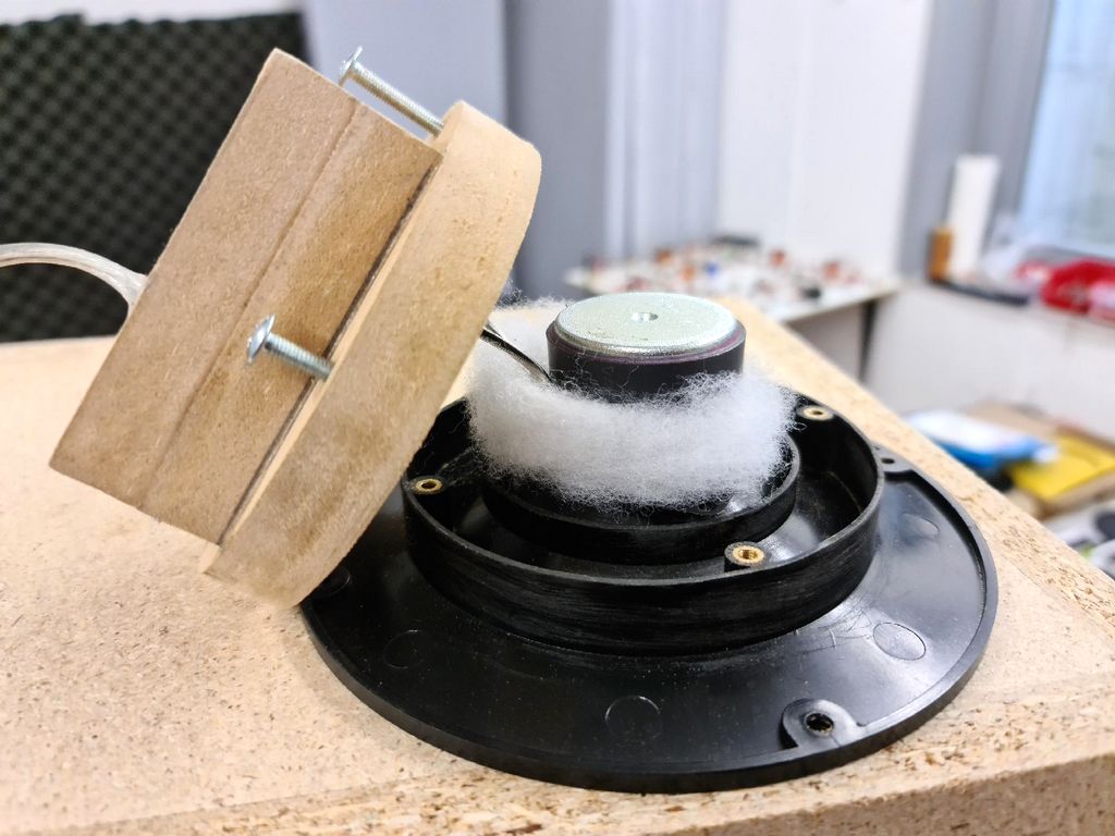 bei meinen Prototypen hatte ich die Weichenteile einfach fliegend verdrahtet außerhalb des Gehäuses. Da ich ja leider einen Tieftöner mit etwas eingedellter Sicke hatte, habe ich die Lautsprecher bereits zerlegt. Es empfiehlt sich, die wenigen Weichenteile auf der Strebe zu verteilen, oder auf irgendwo in Gehäuse an eine Wand zu schrauben. An der Stelle wird das Dämpfungsmaterial einfach ausgespart.
